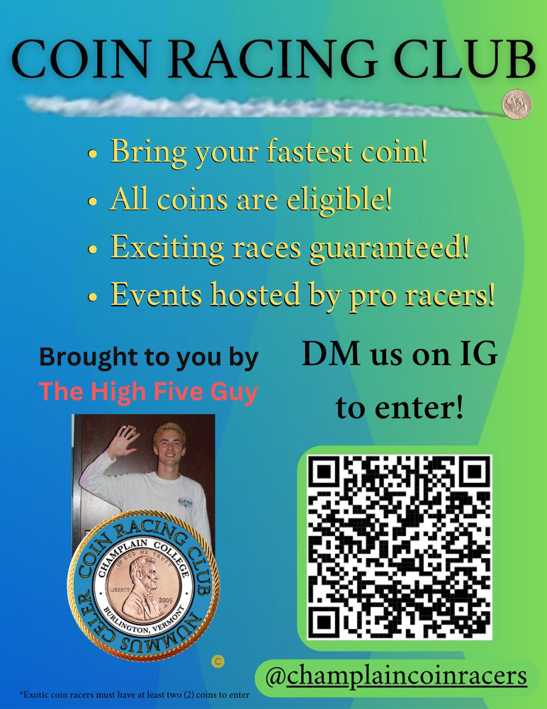"Coin Racing" was a collaboration between myself and my frequent collaborator Walker Mack. It garnered attention from Champlain College's official paper "The Crossover," and took the student body by storm, with nearly 50 people consistently attending every week for 5 total meetings. While Coin Racing certainly got bigger than we ever thought it would, and it means many different things to many different people, to me, Coin Racing was always a social experiment/performance about capitalism, community, and absurdity.